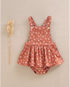 Ranita de bebé niña con tirantes color teja con estampado de hojas blancas y faldita con volante. Tirantes ajustables con botones de madera. N57