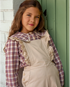 Blusa de niña de cuadros beige claro, morado y teja, manga larga, puño elástico, cuello con fruncido y cierre delantero con botones. N118