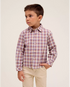 Camisa de niño cuadros beige claro, morado y teja, cuello pico, manga larga y cierre delantero con botones de madera, práctica y elegante.N122