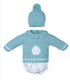 Dulce conjunto para bebé compuesto por jersey de punto en color verde bruma con cuello volante y detalle bordado de conejito en el delantero. Incluye pololo en tejido blanco con estampado a juego y gorrito de punto con borla, perfecto para completar el look. Una opción encantadora, cómoda y abrigada para los días más frescos.