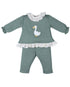 Conjunto sudadera y pantalón afelpados para bebé en color verde oliva. La sudadera de manga larga, con puños fruncidos, luce un dulce bordado de pato en el centro y volantes en cuello y bajo con estampado floral en tonos cálidos. El pantalón a juego, aporta comodidad y libertad de movimiento. Un look coqueto y práctico para el día a día.…
