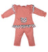Conjunto para bebé niña compuesto por sudadera afelpada en color coral con volantes en hombros y bajo, y detalle de bolsillo delantero, todo rematado con tejido en estampado geométrico tipo ikat en tonos coral, verde y blanco roto. Incluye pantalón largo a juego para un look cómodo y con estilo.