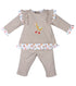Conjunto de sudadera afelpada beige con volantes en hombros, puños y bajo en tejido de hojitas otoñales. Dibujo bordado de patito con botas. Incluye pantalón largo a juego.