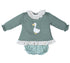 conjunto sudadera afelpada en verde oliva con cuello volante y bajo en estampado de patitos . Ranita en vichy verde