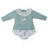 Conjunto de sudadera afelpada en verde con cuello volante y estampado central de un pajarito. Incluye ranita con volante tipo faldita a juego en tejido estampado de hojas en tonos pastel.