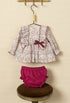 Conjunto de bebé niña formado por jesusito de estampado floral y braguita a juego en color buganvilla. El jesusito luce volantes delanteros con vivo en contraste, lazada lateral de cuadros vichy burdeos y delicados puños fruncidos con volante. La braguita, confeccionada en tejido acolchado buganvilla, completa un conjunto dulce y cómodo con un aire clásico renovado..