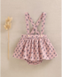 Ranita de bebé niña con tirantes color rosa con estampado de hojas azul y faldita con volante. Tirante ajustable con botones de madera..
