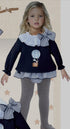 Conjunto ideal para niña compuesto por blusa en color azul marino con cuello volante blanco bordado y gran lazo a rayas en el hombro. El delantero luce un tierno estampado de globo aerostático con ositos, que aporta un aire dulce y original. El bajo y la braguita a juego en tejido de rayas azul y blanco completan este look elegante y coqueto.
