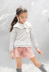 Un conjunto lleno de dulzura y estilo para las más pequeñas. Jersey gris jaspeado con estampado de topos en blanco, cuello bebé de punto a juego y detalle bordado en el pecho. Se combina con un coqueto pantalón corto de micropana rosa empolvado, con lazada frontal y delicado volante en el bajo. Una propuesta cómoda y a la vez muy chic, perfecta para el día a día o para ocasiones especiales.