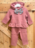 Conjunto sudadera y pantalón afelpados color rosa con capucha . Detalle de lazo en estampado liberty