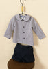 Se compone de una camisa de rayas finas en gris aluminio y azul marino, con cuello bebé ribeteado y botones delanteros que aportan un aire clásico y elegante 👔✨.