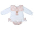 Conjunto de dos piezas en felpa suave compuesto por camiseta blanca con cuello grande de cuadros vichy rosa y bordado de osito en el delantero, con volantes y lacitos laterales, acompañado de braguita a juego en vichy rosa. Ideal para un look coqueto y cómodo..