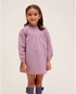 Vestido de niña evasé morado con estrellas grises, fruncido en cuello, manga abullonada y forro interior, cierre trasero con cremallera oculta. N02
