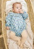 Ranita en fondo verde con estampado de flores en morado y pistacho , cuello fruncido . Apertura de botones en pañal .