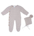 Pelele largo en punto color piedra, con detalle trenzado en el delantero y cierre lateral con botones de madera para mayor comodidad al vestir. Incluye capota a juego con pompón de pelo suave. Un conjunto delicado, práctico y calentito para el día a día del bebé.