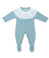 Delicado pelele de punto largo en tono verde empolvado con canesú en contraste blanco y detalles calados.