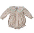 Ranita con estampado liberty en tonos rosas , verdes y naranjas . Pecho fruncido y cuello bebé con ribete vichy verde . Apertura mediantes botones en zona pañal .