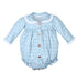 pelele fondo azul con estampado de patitos blanco , cuello bebé con volante en cuello y puño . Cierre mediante botones y apertura pañal .