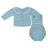 Conjunto de dos piezas para bebé, tejido en suave punto azul con detalle de jacquard en tonos blanco, mostaza y verde. La chaqueta presenta un canesú trabajado con dibujo geométrico y cierre de botones de madera en la parte delantera. La ranita de tirantes a juego, con laterales abotonados y diseño a conjunto en el pecho, completa este look dulce, cómodo y elegante.