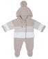 San Francisco de punto en color beige, compuesto por polaina con pies cerrados y chaqueta de capucha con pompón. La parte superior presenta franjas en beige y blanco con diseño de rayas horizontales en mangas y bajo, y cierre cruzado con botones de madera.