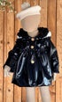 Precioso abrigo impermeable para niña en color marino brillante, ideal para los días de lluvia. Con diseño evasé y cierre de botones en la parte delantera, destaca por sus delicados volantes en puños y capucha, que aportan un toque elegante y femenino. El interior forrado asegura mayor confort y calidez.