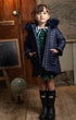Este abrigo acolchado en color azul marino es la prenda perfecta para los días más fríos. Confeccionado en tejido ligero y confortable, cuenta con cierre de cremallera, bolsillos delanteros y una capucha rematada con pelo suave que aporta un toque elegante y cálido.