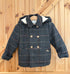 abrigo de paño marino en Maxi cuadro en colores, mostaza, granate y naranja . Forrado en borrego con capucha