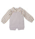 Conjunto de dos piezas formado por camisa de manga larga en cuadros vichy beige con cuello bebé y peto de punto en color piedra con detalle trenzado central y botones de madera en los tirantes. Un look dulce, cómodo y perfecto para cualquier ocasión.