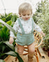 Camisa en fondo blanco cuello bebé con estampado de ositos en tonos beiges y verdes , peto tipo bombacho en bambula verde . Tirantes ampliables . 0031210