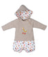 Conjunto de sudadera afelpada beige con capucha forrada en tejido de hojas otoñales y divertido bordado de patito. Incluye bombacho a juego con el mismo estampado. Un look calentito, cómodo y lleno de ternura para los días de otoño.