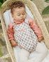 Camisa Terracota cuello volante y peto estampado ikat en tonos tierra y coral. Un diseño lleno de encanto con patrón geométrico y detalle de botón de madera. Ideal para looks otoñales con un toque artesanal.