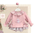 conjunto de sudadera afelpada en tono rosa con cuello bebé en estampado vichy con ribete liberty , lazos laterales y braguita con volante liberty