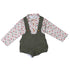 Conjunto para bebé niño formado por camisa de manga larga con cuello mao y estampado de árboles en tonos teja y verde. Se acompaña de un peto corto verde con tirantes y botones de madera. Ideal para coordinar hermanos con estilo..