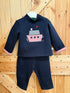 Conjunto de sudadera y pantalón largo afelpados azul marino , dibujo de un barco en el pecho .