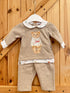 conjunto afelpado de sudadera y pantalón largo en color arena , sudadera con detalle de osito impreso en pecho. Cuello bebé , detalle de puños y bajo de sudadera en tejido fondo blanco con estampado de ositos