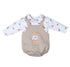 camisa cuello bebé en fondo blanco con estampado de ositos y peto afelpado en color arena .