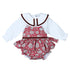 Camisa en bambula blanca cuello peter pan con ribete en terciopelo granate y pichi en fondo rojo con estampado de dalias blancas , ribete frontal en terciopelo