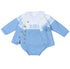 Conjunto de tres piezas formado por chaqueta de punto en celeste con dibujo jacquard en tono nata y botones de madera, peto a juego con detalle de pompones y blusa blanca de plumeti con cuello volante. Un conjunto ideal para los días fríos, cómodo y con mucho encanto..