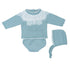 Encantador conjunto de tres piezas en suave punto, compuesto por jersey, cubrepañal y capota a juego.