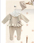 Conjunto de tres piezas en punto suave, compuesto por jersey celeste con diseño jacquard en tono nata, detalle de lazo con pompones y polaina con pie a juego. Incluye gorro a conjunto con pompón. Un look cálido y encantador para los días más fríos