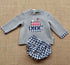 Conjunto de sudadera afelpada en gris , dibujo de un barco en el pecho en cuadros blancos y azules , ranita a juego .