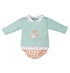 Sudadera en tonos verdes afelpada , cuello bebé con ranita en cuadros mandarina .