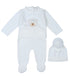 Conjunto de tres piezas en punto blanco, compuesto por jersey con carita de osito en relieve, polaina con pie y gorro a juego con pompón. Suave, dulce y perfecto para primeras puestas o salidas especiales.