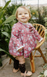 Jesusito en fondo rojo con estampado de Dalias blancas , detalle en cuello y puños fruncido blanco .