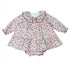 Jesusito de manga larga con estampado de pequeños árboles en tonos teja y verde. Cuello bebé con ribete burdeos, botones de madera y volante en el bajo. Incluye braguita a juego. .