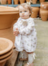 Jesusito tejido de bambula en cuadros rosa y blanco roto con estampado de ositos . Cuello volante