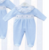 Pijama en blanco y azul con cuello volante.