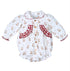 Ranita cuello bebé en fondo blanco con estampado de zorritos con detalle en vichy blanco y rojo .