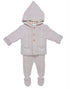 Conjunto de bebé en punto compuesto por chaqueta con capucha estilo duende, bolsillos delanteros y cierre con botones de madera, y polaina a juego con detalle trenzado. Forro interior de la capucha en vichy beige. Un conjunto calentito, cómodo y lleno de estilo para los meses más fríos.