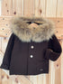 Trenka de punto con botones de madera y pelo natural en capucha desmontable . 100% acrílico de gran calidad , hipoalergénico y muy suave al tacto .